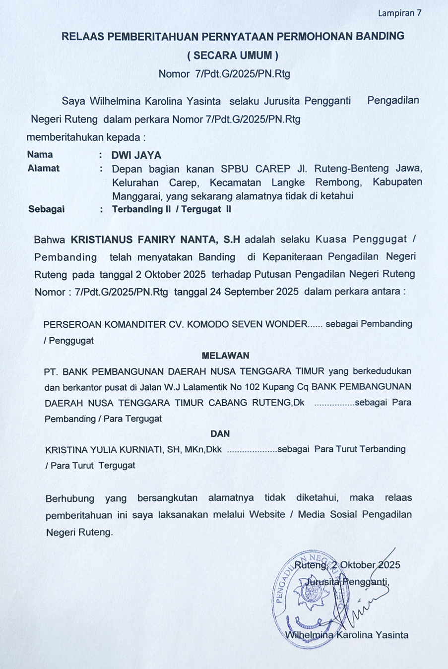 Relaas Pemberitahuan Pernyataan Permohonan Banding Secara Umum perkara Perdata Nomor 7/Pdt.G/2025/PN Rtg kepada Tergugat II atas Nama: DWI JAYA,